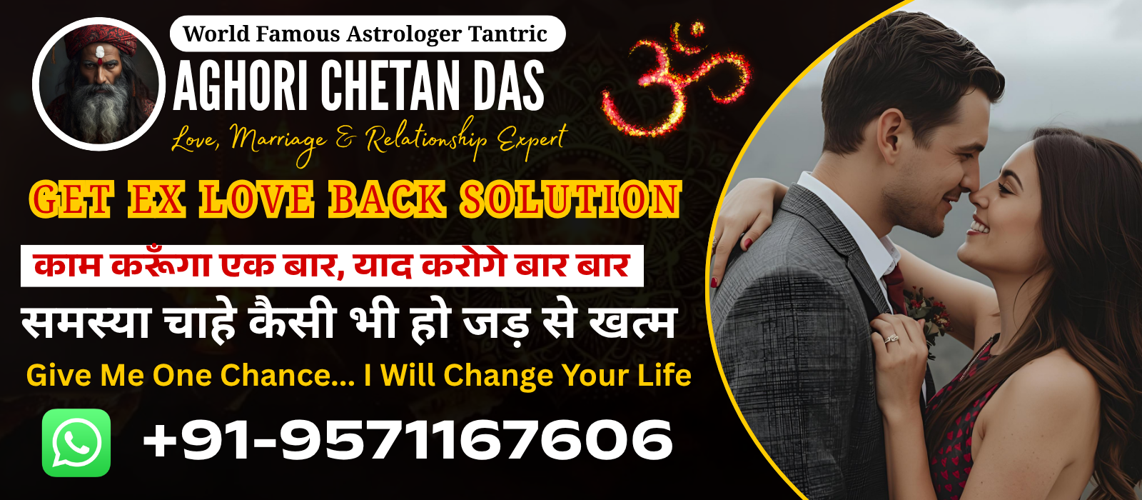 When someone's love drifts away for some reason, it can lead to emptiness, stress, and confusion. Many people are at a loss to understand why the relationship suddenly drifted apart, why things went wrong, or why their partner decided to end it. At such times, simple efforts often prove insufficient, as the cause of the problem may not be ordinary, but rather hidden influences in the planets, constellations, and horoscopes. This is the purpose of Ex Love Back Solution—to understand the invisible forces affecting the relationship and bring the loved ones back together. Aghori Chetan Das Ji, a recognized expert in love-return and relationship repair, helps reunite lovers through his years of experience and powerful spiritual practices. He analyzes the underlying cause and addresses it directly, whether it's planetary influences, third-party interference, negative energy, or estrangement. His solutions are considered completely safe and effective. So if you truly want to get your lost love back, then this solution can prove to be life-changing for you.